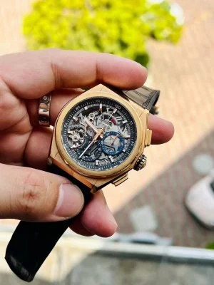 Zenith, Peak Series, Model: 18.9000.9004/71.R585, automatic mechanical men's watch. The entire watch weighs approximately 171.43g and has a diameter of 44MM. It is equipped with the original Zenith EI Primero 9004 self-produced high-frequency automatic movement. The timekeeping is accurate and stable, and the luminescent light is as sharp as a lamp. The case is made of 18K solid gold, with a titanium alloy mixed clasp and a skeletonized dial featuring a dynamic double balance wheel design. It looks sporty and stylish when worn, noble and luxurious. This single watch has no accessories, and the overall condition of the watch is 9 new.
