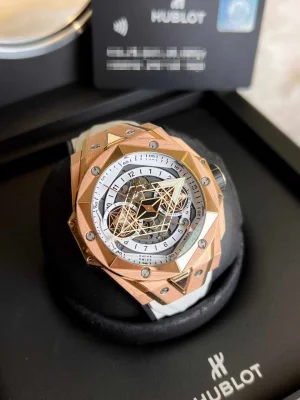 Hublot, Big Bang series, global limited 100 pieces, 418.OX.2001.RX.MXM20 model, rose gold material, 45mm watch diameter, full set, have box and certificate, good price.
