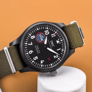 IWC, Pilot Series, Model: IW324712, Rare Pilot Mark XVII TOP GUN Black Ceramic "SFIT" Special Edition, specially designed for US Navy pilots. The entire watch is made of black ceramic and titanium metal. The 41mm black dial features clear and legible numeric markings, night-time luminous indication, a red calendar display, a colored TOP GUN logo at the 9 o'clock position, a titanium push-piece, equipped with the new in-house 35111 automatic winding movement, a titanium back cover, a loop-style military strap, an exclusive container-sized case box, complete set unused, with an eight-year extended warranty!