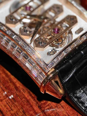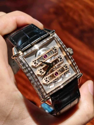 Girard-Perregaux, VINTAGE 1945, Model: 99880B52H00A-BA6A. Made of 18k rose gold. Set with 112 elongated-cut diamonds. Approximately 5 carats. 36.10 x 35.25 millimeters in diameter.