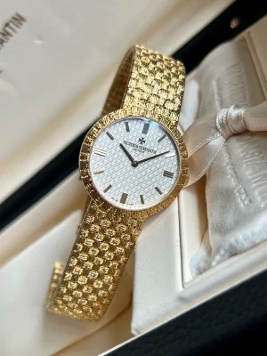 Vacheron Constantin, Heritage Series, Model: 25162/206J-9177, 29mm diameter, 18k gold material, quartz movement, silver-white dial with stick hour markers, the strap features a woven texture on the outside and a smooth surface against the wrist. A piece brimming with luxury. It is both a good investment and suitable for wearing. Now available at a great price.