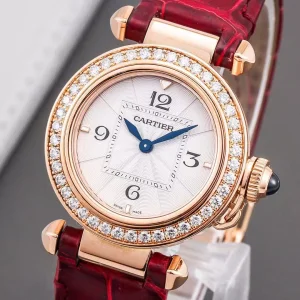 Cartier, Parsa series, model: WJPA0017, ladies' watch, 18k rose gold material, 30mm diameter, diamond-encrusted bezel, white dial with red alligator leather strap, quartz movement.