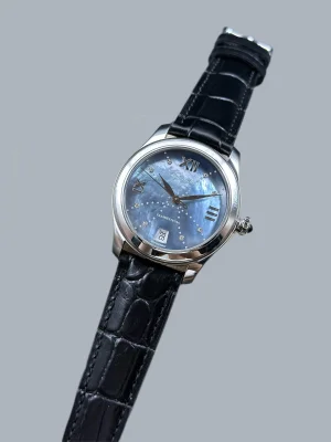 Glashutte Original, model: 1-39-22-11-02-44, automatic mechanical, 40-hour power reserve, stainless steel, three-dimensional mother-of-pearl blue dial, set with 8 diamonds & Roman numeral hour markers, calendar display, Goddess style, very beautiful to wear! The dial diameter is 36MM.