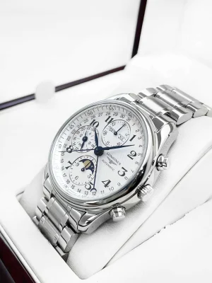 Longines, eight hands, moon phase, Master series, model: L2.673.4.78.6, stainless steel, automatic mechanical men's model, 40mm diameter, stainless steel case, stainless steel strap, date, day of the week, month, moon phase, chronograph, 24-hour function, complete set.