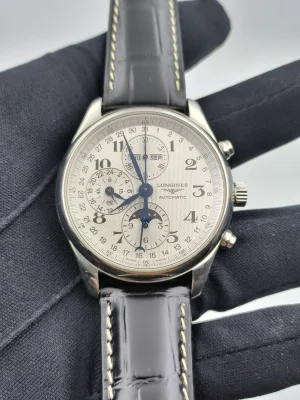 Longines, Eight Needles Moon Phase, Masterpiece Series, L2.773.4.78.3, Men's wristwatch, automatic mechanical, 42mm diameter, silver panda dial, Arabic numeral scale, date, week and month display, moon phase timing function, complete set