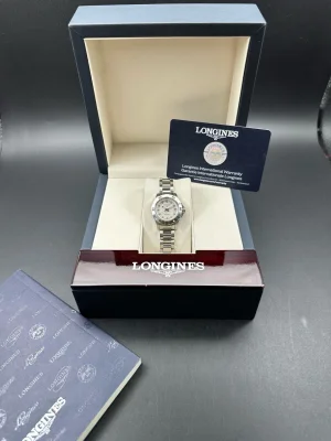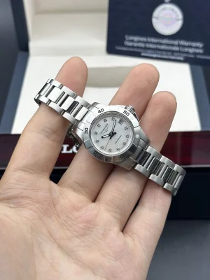 Longines Conquest series, model: L3.198.4.87.6, Ladies' Precision quartz watch, diameter: 25mm, material: stainless steel/steel bracelet, mother-of-pearl dial, diamond hour markers, date display, complete set, 98 new condition.