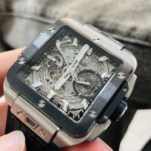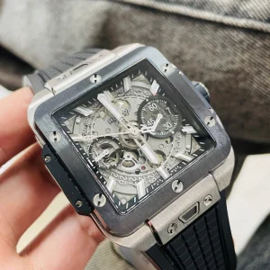 Hublot, Model: 821.NM.0170.RX, new square big explosion, titanium material, diameter 42mm, hollow dial, date display, timing function, transparent automatic machinery, single watch, good price.