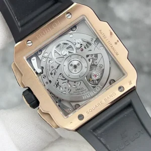 Hublot, 821.OX.0180.RX, square explosion, 18K rose gold material, diameter 42mm, hollow dial, date display, timing function, transparent automatic mechanical