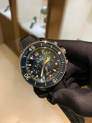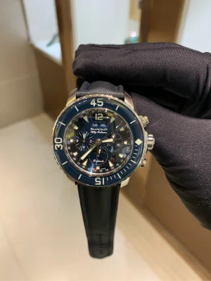 Blancpain, Fifty Fathoms series, Model: 5066F-1140-52B, fine steel blue chronograph, date and moon phase function display, blue ceramic outer ring, diameter 45mm, the best full set.