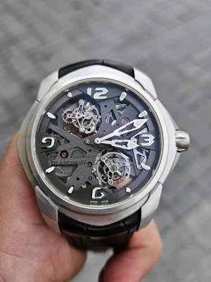 Blancpain, Pioneer series, Model: 92322-34B39-55B, double tourbillon, global limited 50 pieces, PT950 platinum material, diameter 47mm, hollow dial, top process Carso plus tourbillon double escapement, transparent manual machinery, folding buckle, good price.