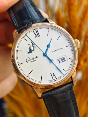 Glashütte Original, Member Series, Model: 1-36-04-02-05-30 Folding Clasp Rare pure gold new original Member moon-phase perpetual calendar. The entire watch is crafted from 18K rose gold, exuding elegance and luxury. The 40mm white dial, the new strip-shaped scale edges embedded with pink digital scales are even more elegant. Blue hands, romantic hourglass-shaped large moon-phase display, large calendar display, equipped with a back-lit in-house 36-04 automatic winding movement, with a 100-hour power reserve, pure gold folding clasp.