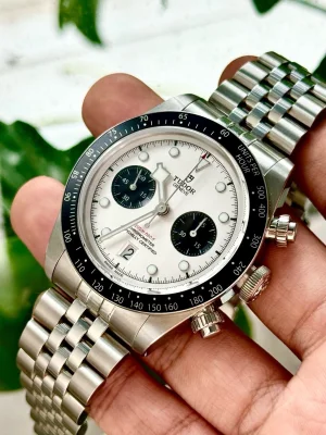 Tudor, model: M79360N-0014, 41mm in diameter, automatic mechanical, solid back case, power reserve of 70 hours, water resistance of 200 meters, steel case, white panda dial, chronograph, date display, latest five-bead bracelet, full-length steel bracelet.