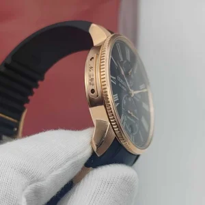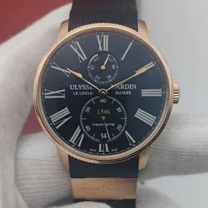 Ulysse Nardin, Seamaster series, model: 1182-310-3/42, wristwatch. The most intuitive impression it gives is the result of the collision between classic and modern. The black matte dial is paired with large Roman numeral hour markers. The two subsidiary dials have a strong presence, occupying the upper and lower sides of the dial respectively. The design of the gold pin, combined with a rose gold case, a coin pattern bezel. 42mm diameter, new UN-118 automatic mechanical movement, 60-hour power reserve, power reserve display at 12 o'clock, rubber strap with 18K gold small squares and rose gold folding clasp.