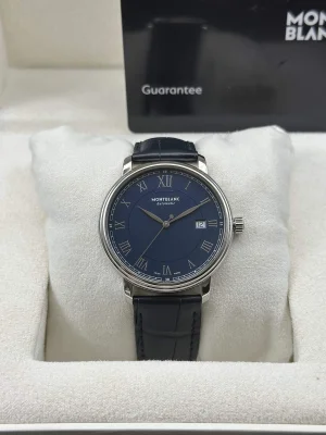 Montblanc, Traditional series, Model: U0117829, 40mm case diameter, automatic mechanical watch, most beautiful blue dial, Roman hour markers, complete set.