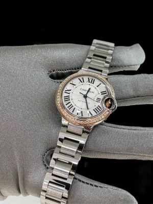 Cartier, Blue Balloon Series, Model: WE902080, automatic mechanical watch for women, 18K rose gold ring with original diamond, 33MM diameter, single watch.