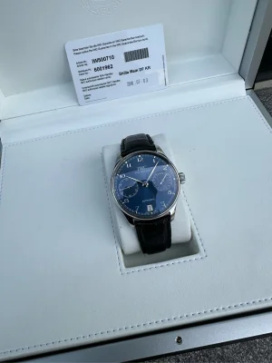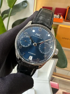 IWC,Portuguese series, Model: IW500710, Blue face, Portuguese seven, 42.3mm diameter, radial blue face, seven-day chain function, latest Woodpecker movement, 2018 Guarantee card.