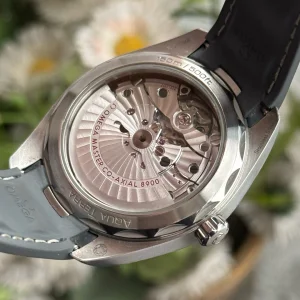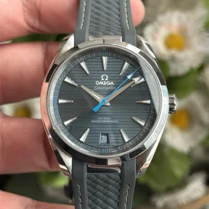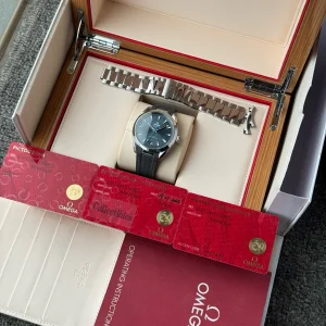 Omega, Haima 150 series, Model: 220.12.41.21.03.002, men's automatic mechanical watch, complete set of accessories as shown (with a steel belt), purchased in 2023, 41mm diameter, horizontal texture dial, blue face blue needle, equipped with 8900 movement, 6 o 'clock position also has a calendar window.