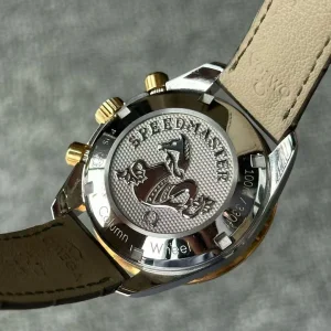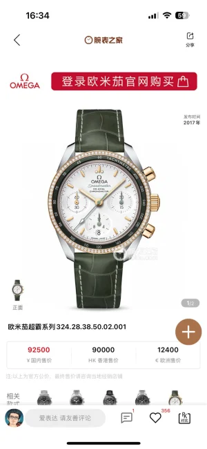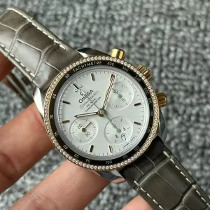 Omega Speedmaster, model: 324.28.38.50.02.001, automatic mechanical watch, single piece 99 new, rare green gold Speedmaster, the entire watch is made of 18K gold with diamonds and stainless steel, 38mm white dial, suitable for both men and women, gold hour markers and hands, luminous indicators, three small dials chronograph function, green second hand, green word fixed bezel with gold, gold crown and pushers, equipped with self-made 3330 coaxial automatic winding movement, engraved seahorse logo on the back cover, folding clasp, 100 meters water resistant. Now at a good price.