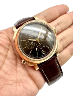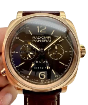 Panerai, Special Edition, Model: PAM00502, a rare limited edition pure gold eight-day bracelet, limited to 300 pieces worldwide. The entire watch is crafted from 18K rose gold, elegant and grand. Diameter: 45mm, black dial, rose gold hour markers, luminous indicators, dual-hand chronograph function, date display, eight-day winding power reserve display, equipped with a transparent self-produced P.2004/10 manual winding skeleton movement, pure gold folding clasp.