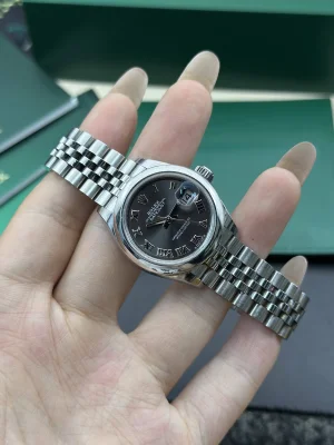 Rolex, Women's Diary Watch, Model: M279160-0011, 28mm grey round dial featuring Roman numeral hour markers and calendar display, automatic mechanical movement, folding clasp
