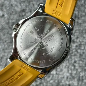 Breitling, Super Marine Series, Model: A173677A1B1S1, Automatic mechanical watch, purchased in 2023, new model with a global limited edition of 100 units, 44MM diameter, 1000M water resistance, dual-color white and yellow scale, full night light scale, yellow hands, yellow strap, one-way rotating bezel, extremely hard to find. Currently at a good price.