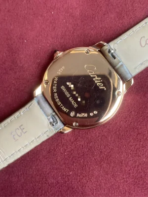 Cartier, Ronde Louis Cartier,Model: WGRN0013, 29mm diameter, quartz movement, rose gold material, rose gold case and beaded crown, set with 1 sapphire. Beige sandblasted dial. Sword shaped blue steel hands. Sapphire crystal mirror, semi-matte purple brown crocodile strap, 18K rose gold needle buckle, the whole watch appearance is outstanding, simple and noble ~