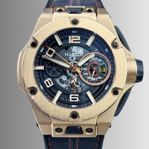Hublot, model: 402.OX.0138.WR, complete set, limited to 500 pieces in collaboration with Ferrari, made of 18K rose gold, with a diameter of 45mm, black skeletonized dial, integrating classic elements of Ferrari, chronograph function, date display, transparent case back, automatic mechanical.