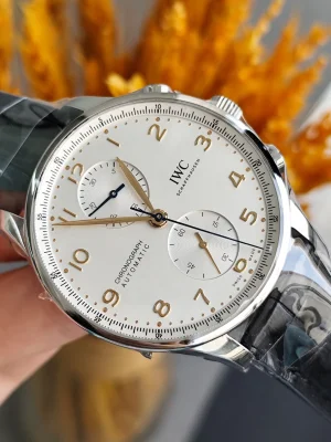 IWC, Portuguese series, model: IW371604, 41mm case diameter, white dial, golden hour markers, dual sub-dial chronograph function, blue chronograph large seconds hand, made of stainless steel, ultra-thin design, equipped with the new self-produced 69355 automatic winding movement with a transparent back, folding clasp.